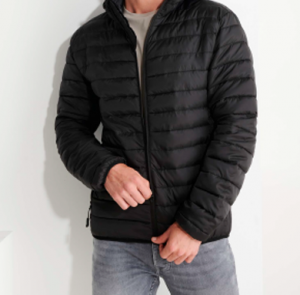 Giacca da uomo trapuntata con imbottitura tatto piuma e cappuccio fisso regolabile. 1.- Cerniera invertita…