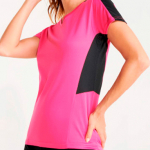 T-shirt tecnica maniche corte per donna. 1. Collo a V. 2. Laterali e spalle con due tessuti di poliestere. 3. Tessuto principale occhio di penice e tessuto reticolare 3D sulle spalle e sui laterali. 4. Tessuto trattato per l’assorbimento della umidità.